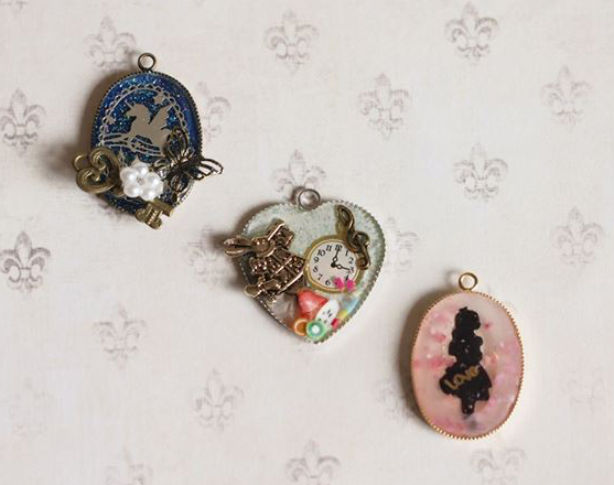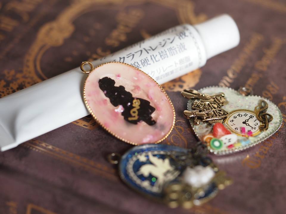 その特性を利用して写真や絵を樹脂の中に閉じ込めたり、ビーズやチャームを盛りつけたり、アイデア次第で様々なオリジナルアクセサリーを作る事ができます。