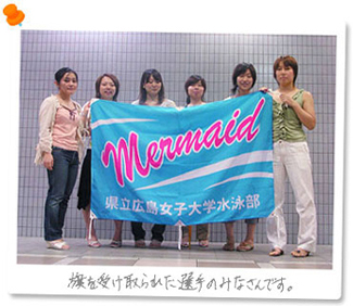 『私共で作っていただいた旗がこのような気持ちのこもった贈り物として使っていただけてとてもうれしく思います。私は学生時代スポーツをしていなかったのでスポーツを通しての感動や絆という経験をしていないこともあって、部旗に対する思い入れを実体験していないのでIさんからお聞かせいただきとてもうら やましくなりました。学生時代にスポーツをしていたら良かったな~なんて少し後悔しています。この旗には「県立広島女子大学水泳部」という名がいつまでも残り今後皆さんに触れるたびに心に感動がよみがえるんですね。そのお手伝いをさせていただいたことはとても嬉しいです。』