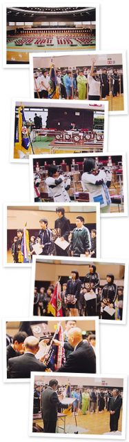 ファイナル競技終了後は ビーム・ライフル射撃競技会場独特の 会場撤収を競技役員と参加選手全員が参加して行われ、 広いドーム会場も閉会式までには 机や椅子、機器、床マットも片付けられ 閉会式を迎えました。そして個人入賞の8位までの中学生の部と 高校生男女が表彰された後、 オリジナル優勝旗が男子団体優勝高校の 滋賀県水口高校に紺色優勝旗(持ち回り)と 楯、賞状が授与されました。