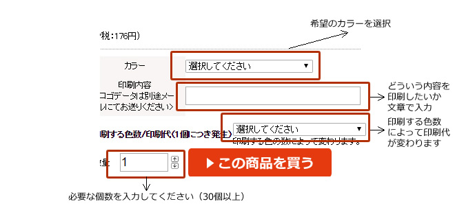 ①まずはカラー・印刷内容・印刷代・個数を入力します。