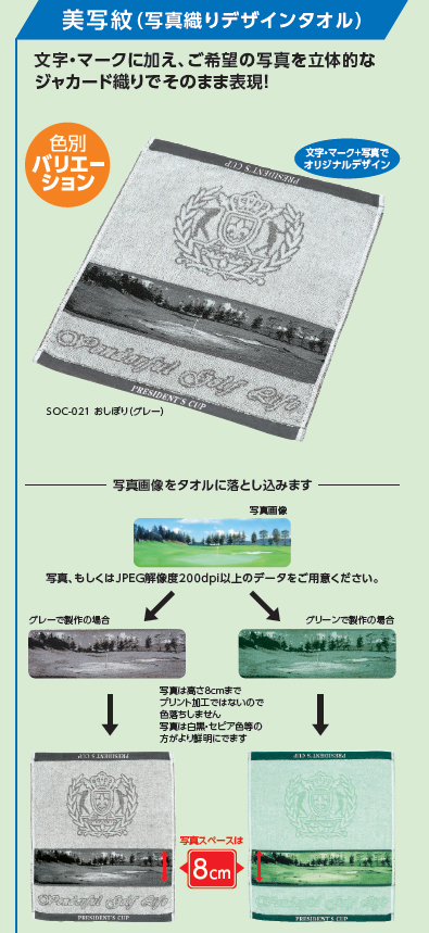 文字・マークに加え、ご希望の写真を立体的なシャカード織りでそのまま表現。