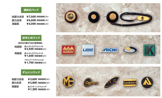 一口に「社章」と言っても仕様や裏の止め具の種類など多岐に亘ります。