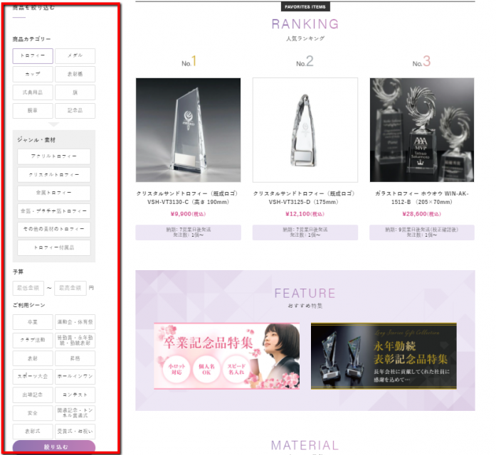 商品カテゴリーでは左ナビで、商品カテゴリー⇒素材⇒ご予算⇒ご利用シーン⇒ご希望納期と選んで